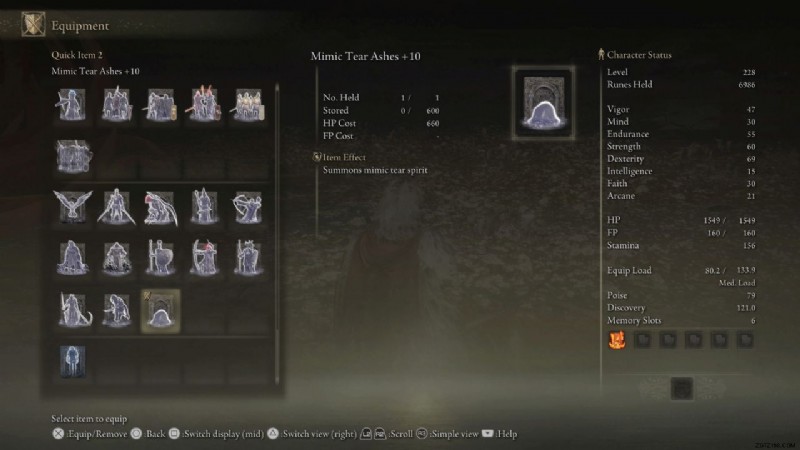 そのため、このチーズ戦略を支援するために Ashen Remains も使用する必要があります。 Mimic Tear Ashes を使用して、手持ちの Flamberge をコピーする必要があります。 Mimic Tear は、マレニアに対する驚異的な可能性に加えて、武器から霜と出血の効果も得ます。ここからチーズが始まります。