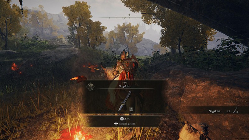 Mountaintops of the Giants に到達して Shabiri に会う前に Yura のクエストラインを完了していない場合でも、Seaside Ruins Site of Grace の近くにある Yura のキャンプに行くことで刀を入手できます。エリアに入ると、カタナは火の近くの地面にあります。エルデン リングでナガキバ カタナを効率的に使用するには、少なくとも筋力 18 と器用さ 22 が必要であることに注意してください。