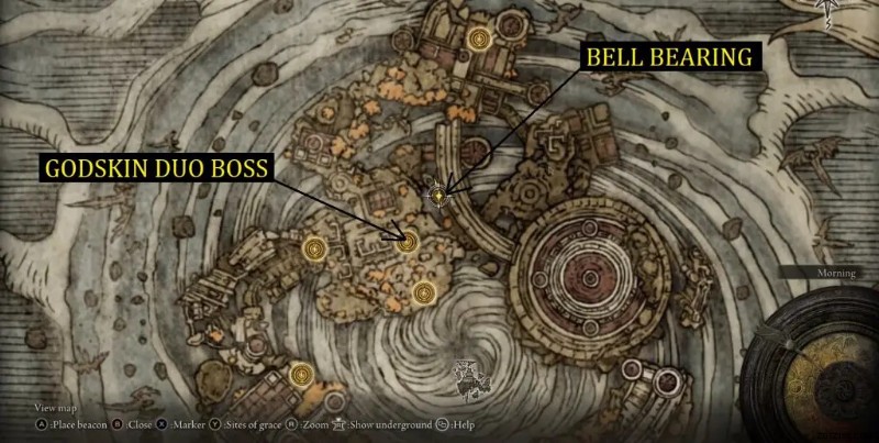 ゴッドスキン デュオのボスを倒した後、北のドアから出て、赤い稲妻を放っているドラゴンが見えるまで進みます .そこから右に曲がり、マップ上の Somberstone Miner's Bell Bearing [5] があるエリアに到達します。アイテムは死体にあります .