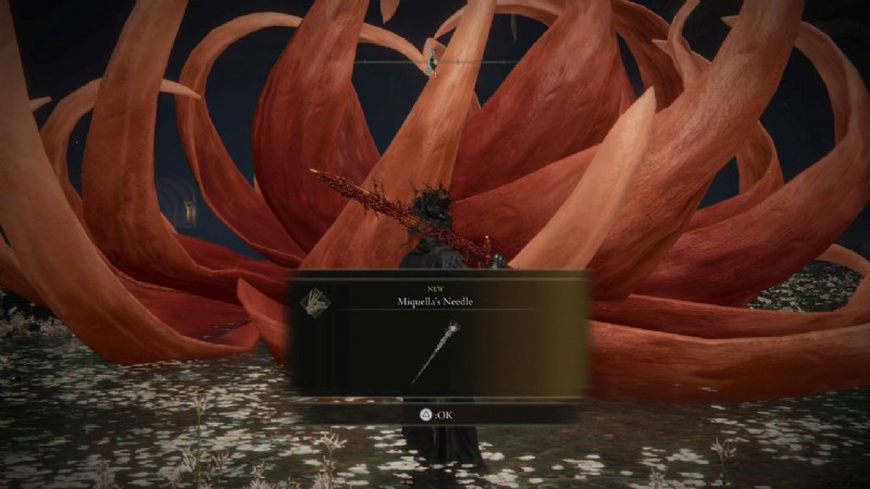 クエスト中、最終的にUnalloyed Gold Needleを手に入れたら、目を光らせてください.ミリセントのクエストを完了してマレニアを倒すと、マレニアの闘技場に咲く花にその針を使用する必要があります。代わりにミケラの針を受け取ります。