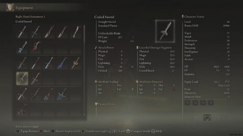 ここで新しいが見つかります 暗号化された剣 .そのユニークなウェポン スキルは「アンブロックブル ブレード」です。 ユニークスキルのページによると、これは「サイファーブレードに光を吹き込み、その長さを伸ばし、突然のスイープ攻撃で攻撃する」. 「防御不能の刃」はその名の通り、防御できません .必要なのは信仰力20だけです ベース 85 のホーリー ダメージしか与えないため、この武器を使用するには .