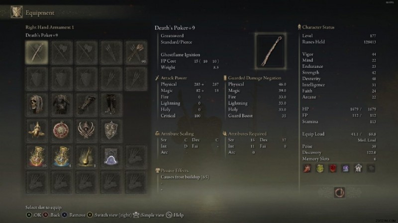 この Death's Poker は、Elden Ring のプレイスルー全体で見られる 9 つのアップグレード後の武器の様子を示しています。この武器には器用さ 17、筋力 15、知性 11 が必要です