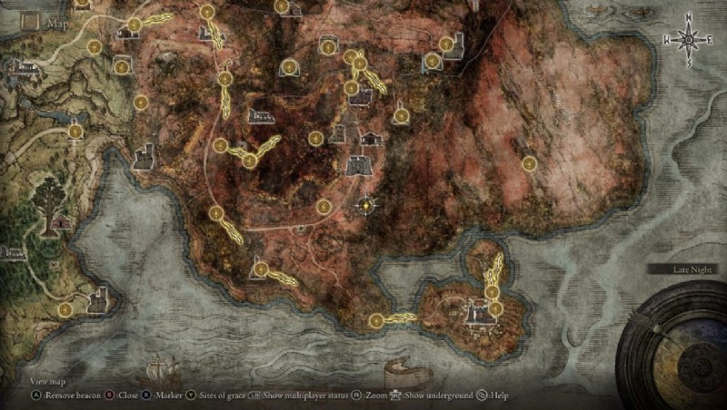 Death's Poker を入手するには、Caelid に移動する必要があります 、ゲームの開始時に利用可能です。 このマーカーに向かう必要があります Limgrave と Caelid の境界線のはるか東にある地図。ただし、Torrent を入手することをお勧めします 最初に旅をより速くします。