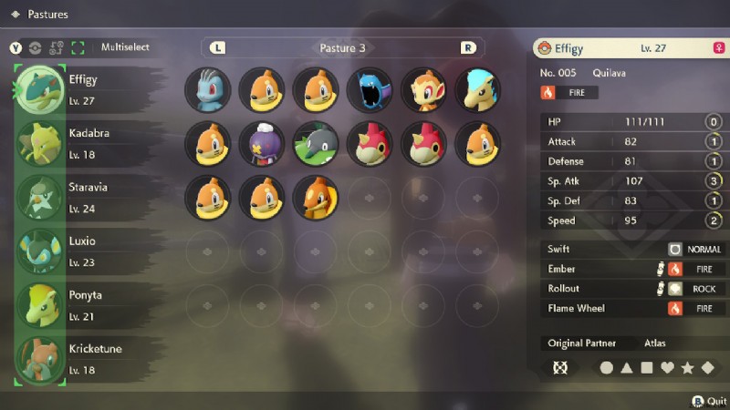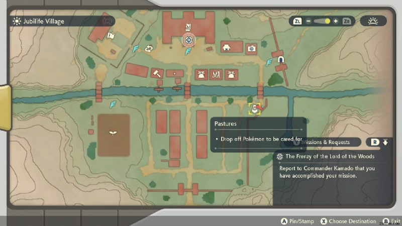 簡単に言えば、ゲームが過去に行われたため、PC ボックスはなく、代わりに パスチャー があります。 捕まえたポケモンを預ける場所。機能は同じですが、フェンスの外から最近捕まえたポケモンを見ることができます。ただし、牧草地にアクセスするには、ジュビライフ ビレッジの出口の向かいにある小さな橋を南に渡ってください。 マリーと話す 、牧草地の世話をする人。彼女はポケモンを彼女と一緒に残したいかどうか尋ね、その後牧草地メニューに移動します.以前のゲームと同じように、牧草地またはパーティーにリストされているポケモンを選択し、移動して整理するか、メインのラインナップに入れ替えることができます。 グリットアイテムが得られるので、可能な場合は解放オプションも検討してください。 ほこりのように 、砂利 、小石 、岩 、努力値 (EV) でポケモンを訓練し、基本ステータスを最大の可能性まで上げるために使用できます。