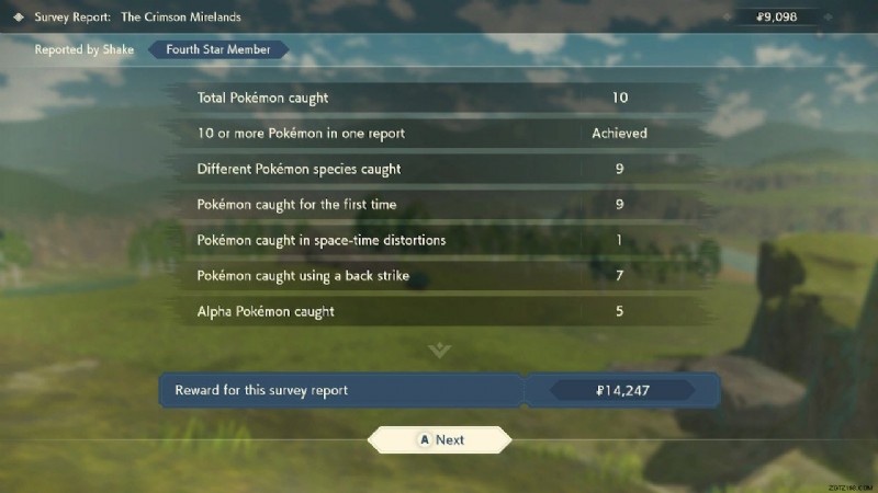 各研究タスクのさまざまなマイルストーンを完了すると、キャンプに戻ってラベントン教授に報告するときにカウントされます。また、1 回のセッションで 10 匹以上のポケモンを捕まえることもできます 世界で。 Laventon がすべての調査結果を記録した後、支払いに対して価値のあるボーナスを提供します。