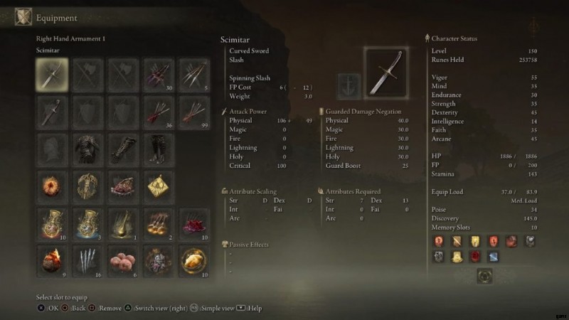 この時点で、3 つの装備をどちらかの手にバインドし、コントローラーの左右の D-pad ボタンを押すことでそれらを順番に切り替えることができます。右手に大剣、左手に盾、魔法の杖、または封印を持つことができます。これは通常、ほとんどのプレイヤーが装備しているものです。