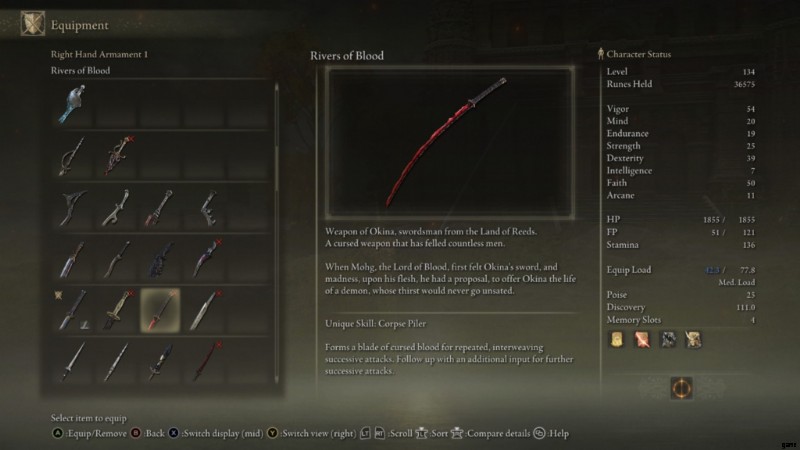 Ending off our list with our number 1 pick, we have the wonderful Rivers of Blood. This weapon is light but packs a serious punch. With great scaling, damage, and exceptional weapon skill, this weapon can annihilate even the end-game bosses with minimal effort. Of all the Katanas mentioned on this list, this is the best due to range, damage, and status effect infliction speed.