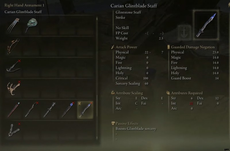 Carain Glintblade Staff で効果的にキャストするには、6 力、22 知性、および 12 器用さが必要です。 Glintstone Staff であるため、Carian Phalanx、Magic Glintblade、Carian Retaliation、Greatblade Phalanx、Glintblade Phalanx ソーサリーに 15% のブーストを提供します。さらに、スタッフにアッシュ オブ ウォーを適用することもできます。