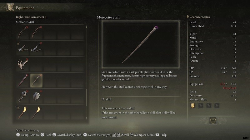Meteorite Staff も主にスケーリングし、Intelligence で S スケーリングを持ちます。これは、武器が Elden Ring で持つことができる最高のスケーリングです。メテオライト スタッフを装備するには、18 Int と 6 Str が必要です。