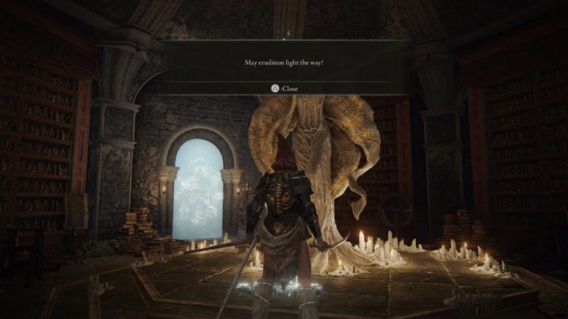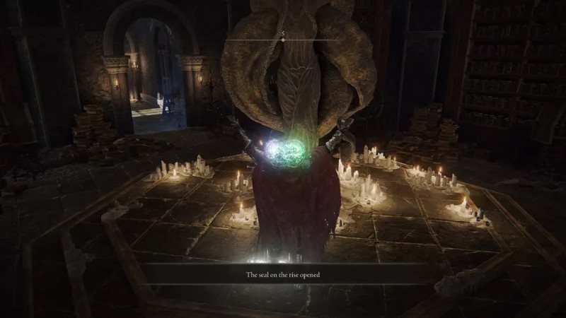 Glintstone Crown を入手し、Erudition のジェスチャーを習得したら、Tower に戻ります。グリントストーン クラウンを装備し、乙女像の前でジェスチャーを実行します。グリントストーンの王冠が光り、魔法の封印が消えます。これで、塔に入ることができます。