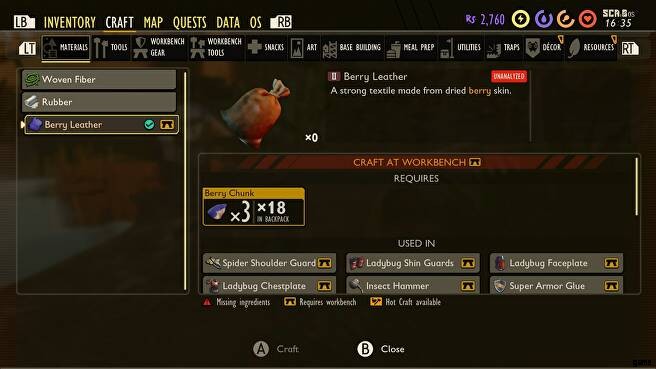 ベリーチャンクをいくつか手に入れたら、それらをラボに持って行き、分析します。近くの木にはラボがあるので、必要に応じてそれを使用できます。これにより、ベリーレザーのレシピがアンロックされます。作成するベリー レザー 1 つにつき 3 つのベリー チャンクを使用する必要があります。ワークベンチでクラフトする必要があります。