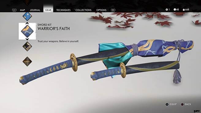 ソードキットを入手したら、ポーズメニューのギアセクションに移動し、Sakai Steelセクションを選択してから刀自体を選択することで、刀とナイフの外観を変更できます.これにより、見つけたすべての剣キットの完全なリストが表示されます。見た目が気に入ったものをクリックして、ゲームで装備してください。