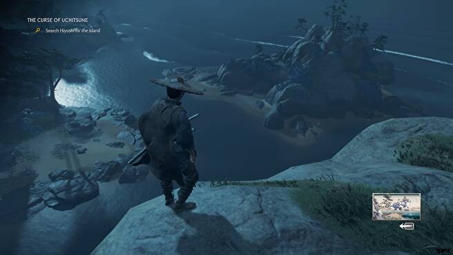 広大な海岸線を探索できますが、幸い島は 2 つしかありません。検索可能なエリアの約 4 分の 3 にある最北端の場所が必要です。もう 1 つは神社のチャレンジであり、完了までに長い時間がかかりますが、それが間違った場所であることに気付くだけです。青いアジサイで覆われた島のある小さな湾が見つかるまで、それを通り過ぎます。降りるのは簡単ではありませんが、湾自体の北面にビーチに続く小道があり、そこから砂州と浅瀬を渡って島自体に行くことができます。目の前に洞窟があり、次の手がかりはアーチェリーの練習用のターゲットです。その周りを探して、次の場所、山が 2 つに分かれている場所を探します。洞窟を出ると、天狗僧が現れて再び警告し、弓を放っておくように言います。