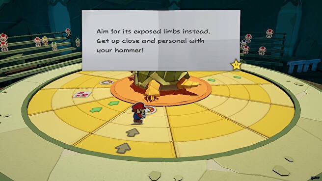 Paper Mario The Origami King で Earth Vellumental のボスを倒すには、最初に、戦闘の開始時に提示される新しいパズル リング システムを理解する必要があります。このリングには、さまざまな方向にあなたを送るタイルが含まれています。あなたの目標は、通常の戦いと同じようにリングを動かして、矢印があなたを必要な場所に送ることです。攻撃するには、ランの終わりに赤と黄色の円をヒットする必要があります。最も内側の円にあるこのタイルに着地することを目指してから、次の手順に従って地球の Vellumental を倒します。