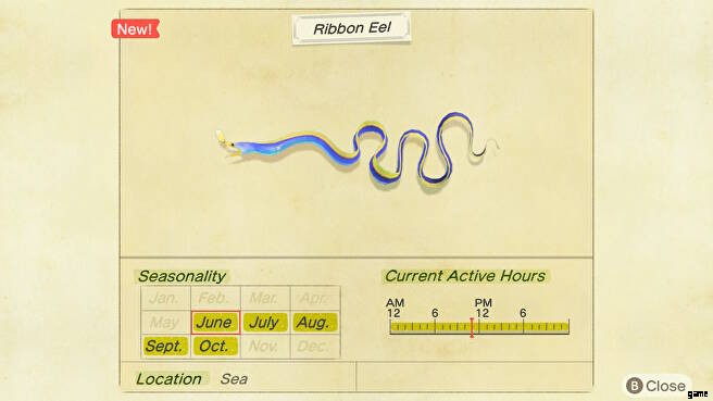 リボンウナギを捕まえることができたら、Nook's Cranny で 600 ベルで売ることができます。待ってから CJ に売却すると (CJ についてはこのガイドで詳しく説明します)、900 ベルを獲得できます。ウナギを博物館の Blathers に寄付することをお勧めします (博物館の詳細はこちら)。