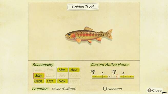 ゴールデントラウトはティミーとトミーに 15,000 ベルで売ることができ、ゲームで最も価値のある魚の 1 つです。または、Blathers に寄付することもできます (魚や虫の寄付の詳細はこちら)。 1 匹の魚でさらに多くのベルを稼ぎたい場合は、CJ が来るまでゴールデン トラウトを保管することを検討してください。彼は 1 匹あたり 22,500 で購入します。CJ と彼の「シースポーツ」チャレンジについて詳しくは、こちらをご覧ください。