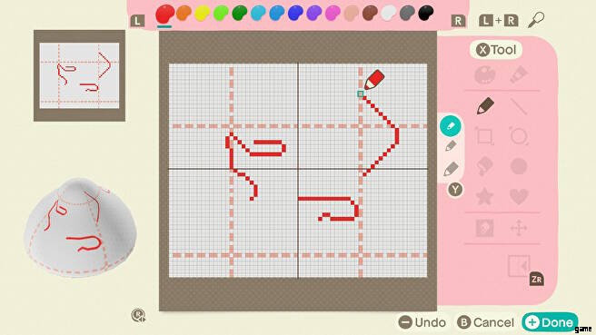 カスタム デザインを作成するには、NookPhone にアプリが必要です。これはゲーム開始時に与えられます。 「ZL」で電話を開き、カスタム デザイン アプリを選択します。ここから、独自のデザインを作成できます。 「L」と「R」で色を切り替えることができ、「Y」で鉛筆のサイズを大きくすることができます。画面の右側にいくつかのオプションが表示されます。最初にこれらを試すことをお勧めします。たとえば、星、ハート、円を追加できます。