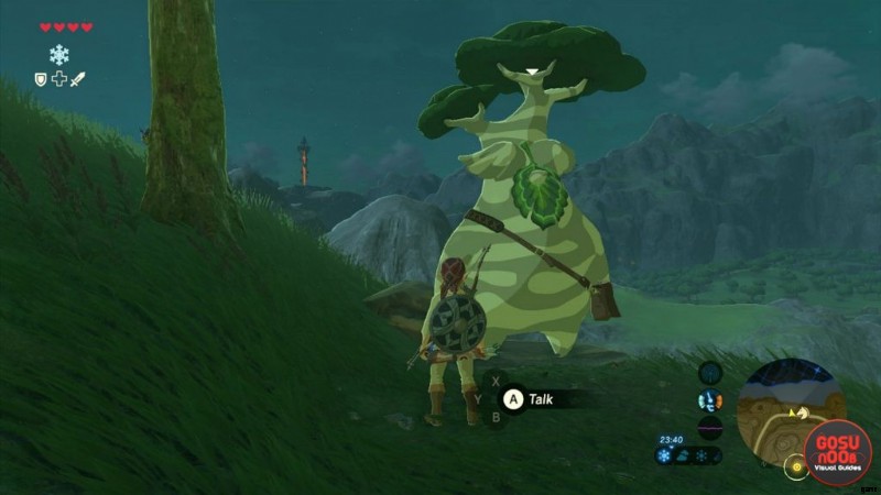 上の画像の巨大なブロッコリーのような生き物は Hestu で、在庫をアップグレードする力があります。デュエルピークスの後にカカリコ橋を渡ってください。東に曲がる道を進みます。坂を上っていくと、右側の木の下にヘストゥが立っています。話しかけると、プライスレス マラカスという短いサイド クエストが与えられます。 .