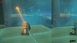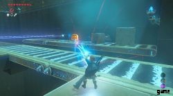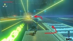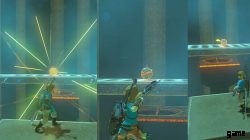 2 番目の部屋も同じ状況ですが、今回は動くプラットフォームに 2 人のガーディアンがいます。リンクに向かってレーザーを発射するので、矢を使って対処するのが最善です。この部屋の動くプラットホームは、あなたが立っているプラットホームから少し離れているため、リモートボムはそこに到達できず、ボールを撃ってゴールに向かって移動させる必要があります。